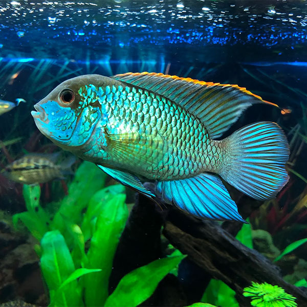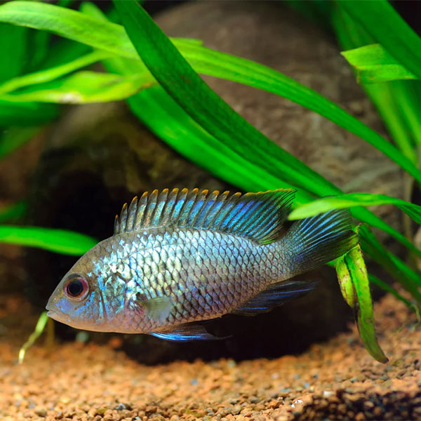 The striking blue tones of the Electric Blue Acara provide a beautiful contrast against lush green plants (e.g., Java Fern, Anubias Barteri) and natural décor.